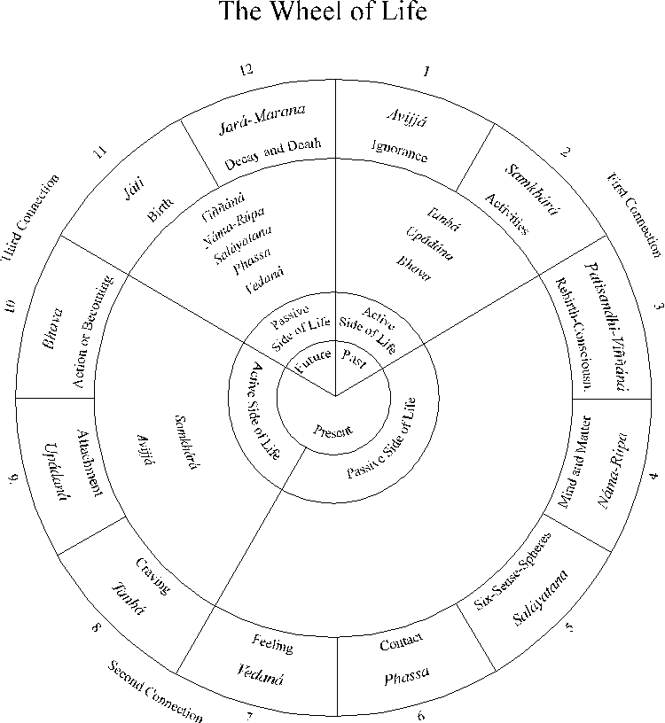 Ignorance and Conditioning Activities belong to the past; Birth, Decay, Death belong to the future; the intermediate eight to the present. Thus there are three periods.